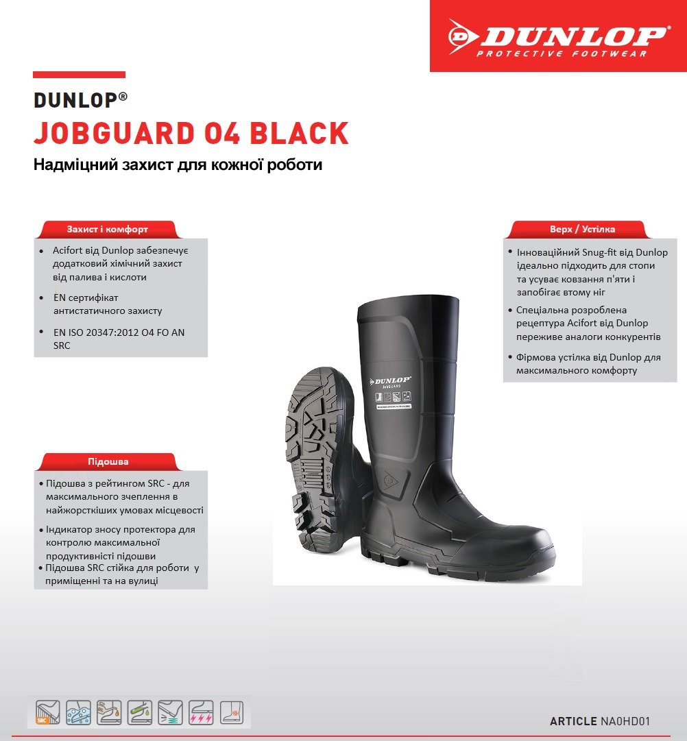 Захисні гумові чоботи DUNLOP ACIFORT JobGUARD виготовлені за запатентованою технологією. Acifort® – це унікальний матеріал від Dunlop, що забезпечує додаткові можливості